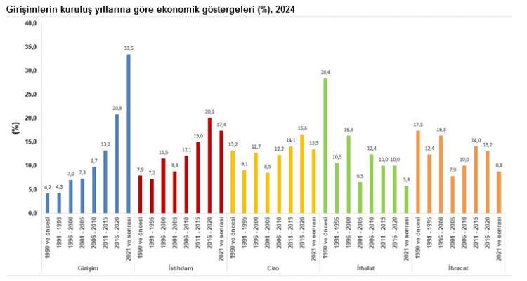 Kuruluş yılına göre değerlendirmelerde ise 2016-2020 yılları arasında kurulan girişimlerin 2024’teki ciro payı yüzde 16,6, istihdam payı yüzde 20,1 oldu. 2021 ve sonrası kurulan girişimler ise yüzde 17,4’lük istihdam payına sahip. Eski girişimlerde ise 1990 ve öncesi kurulan girişimlerin ihracat payı yüzde 17,3, ithalat payı yüzde 28,4 olarak kaydedildi.