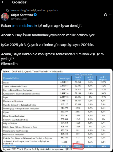 CHP Genel Başkan Yardımcısı Yalçın Karatepe, İŞKUR verileriyle Bakan Şimşek’in açıklamasını karşılaştırarak “Acaba Sayın Bakan’ın açıklamasından sonra 1,4 milyon kişi bir anda işe mi yerleşti?” diyerek ironik bir paylaşım yaptı.
