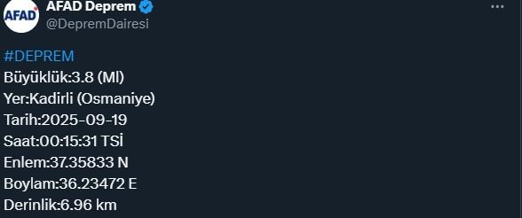 Afet ve Acil Durum Yönetimi Başkanlığı (AFAD) verilerine göre merkez üssü Osmaniye’nin Kadirli ilçesinde saat bir deprem meydana geldi.
